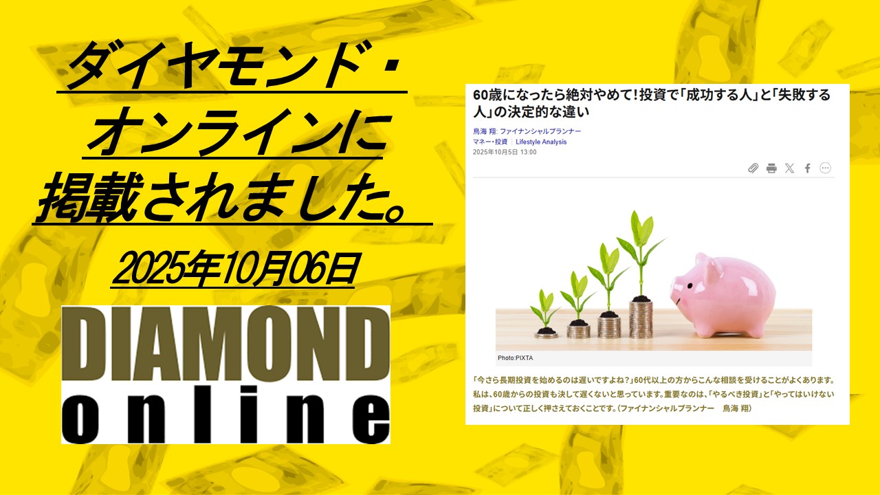 ファイナンシャルプランナー鳥海翔の記事が、国内最大級の経済メディア「ダイヤモンド・オンライン」に掲載されました。